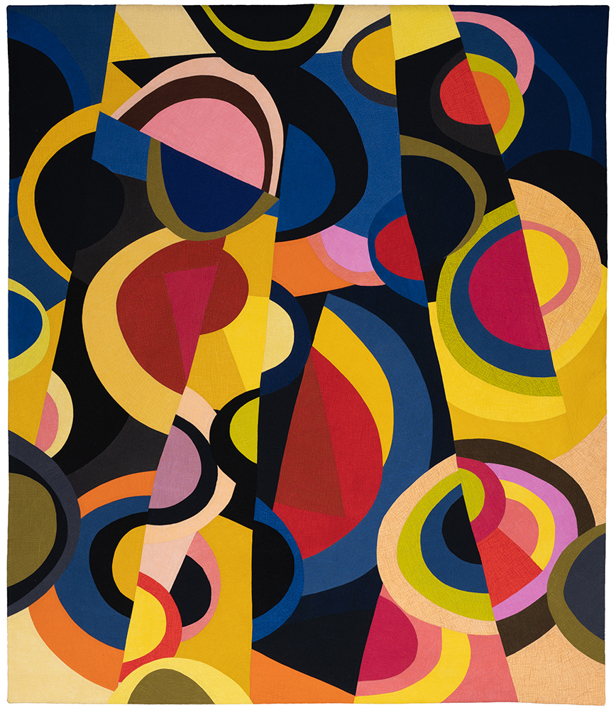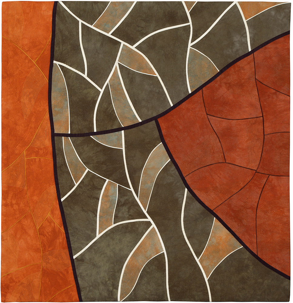 In her art quilting, she draws on her fascination with “art’s essentials: color, line, shape, texture.” She finds abstract art especially compelling: “it grabs my attention and moves me viscerally.” Her work Otter is from her Core Stories Series, which consists of several quilts based on “the circle, abstracted”. The works ask viewers to consider the fundamental nature of things and remind us that things aren’t always as they seem. Are shapes cores, or are they holes? Cores shapeshift into holes and, as Julie explains it, “what forms, transforms, deforms; what we have, what we miss; abstract, concrete. The core of my story: pretty tough; very lucky.”