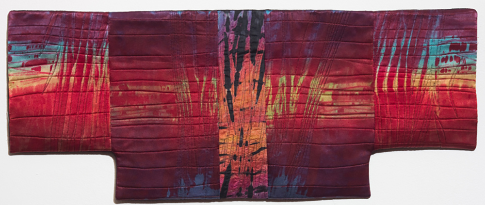 Much of Judith’s work is made from hand-dyed silks. In dyeing fabric, she adds and subtracts colors in layers and relishes in the sometimes unexpected results. As Judith explains, “although I can control the results to a great extent, the element of surprise when the designs are revealed never fails to excite me.” Throughout her process, she relies on intuition as well as experience. Rather than taking detailed notes on various process outcomes, she allows “each dye session to enlighten the next” and finds inspiration in diverse silks that are “strewn on the studio floor, torn up, arranged and rearranged until they resonate.” When the composition is ready, she meticulously secures fragments to the design wall and, after further study and refining, she sews, quilts, and sometimes appliqués to accentuate depth or movement in the piece.