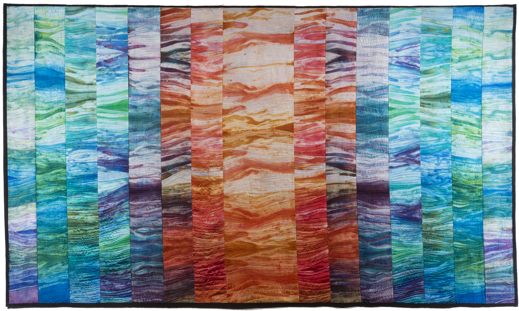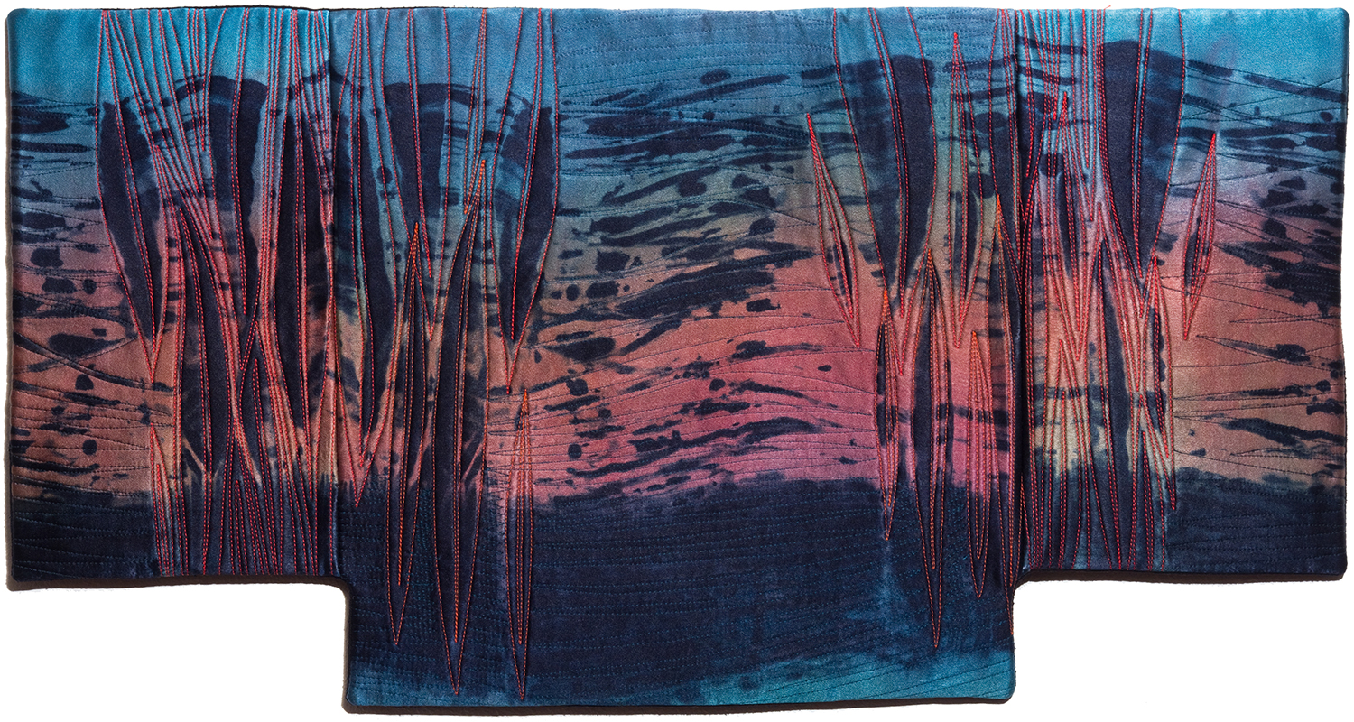 In keeping with this evocation of a force of nature, Judith’s hand-dyed, pieced and quilted silk wall pieces are inspired by the interplay of light and shadow on waterfalls, cliffs, canyon walls, coastal wetlands, and the desert. The theme of nature’s power and beauty is particularly evident in her works Squall Line and Passage and imbue other pieces as well, such as Meltwater and Aftermath, all on display in two of our galleries.
